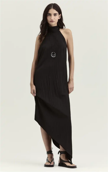 Vestido assimétrico de frente única, que confere movimento e fluidez. A modelagem valoriza o caimento do tecido, resultando em uma peça elegante, perfeita para ocasiões especiais ou propostas de resort wear contemporâneo.